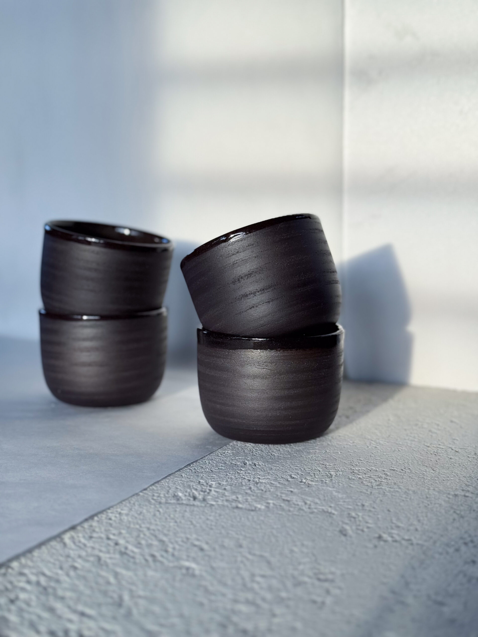 Kalíšek z černé hlíny s transparentní glazurou.