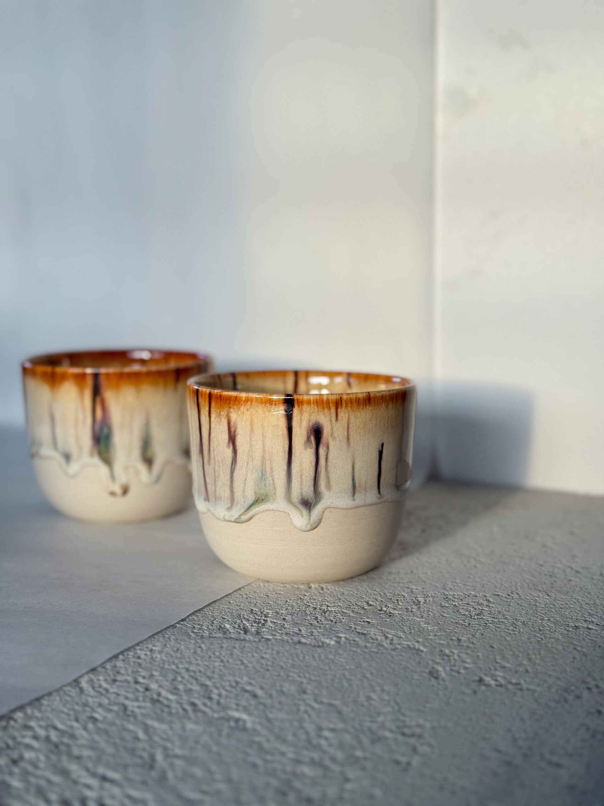 Kalíšek z bílé hlíny se stékaknou glazurou. Z vnější strany kalíšku je malinká prasklinka – pouze estetická vada.