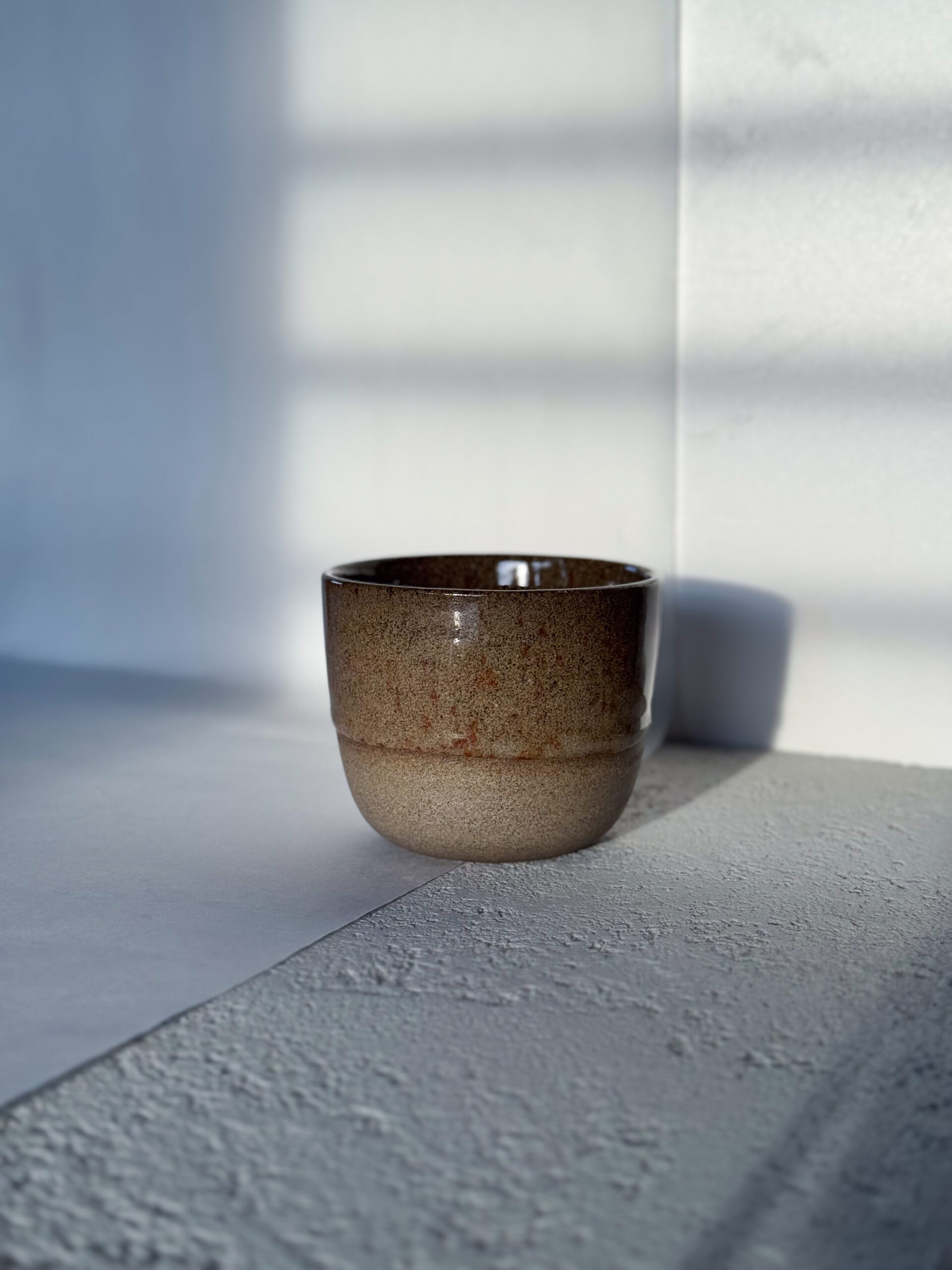 Kalíšek ze šedé hlíny s transparentní glazurou s tečkami.