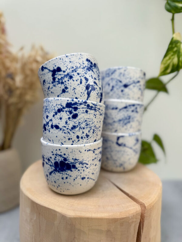 Kalíšek z bílé hlíny s inkoustovými skvrnami.