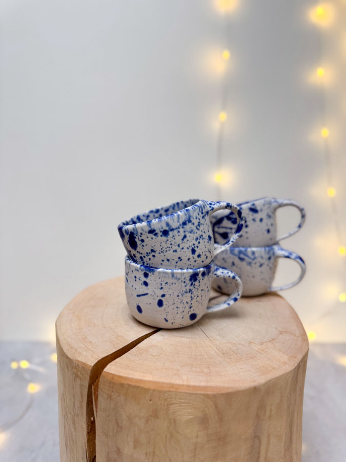 Hrneček ze světlé hlíny s ink glazurou.