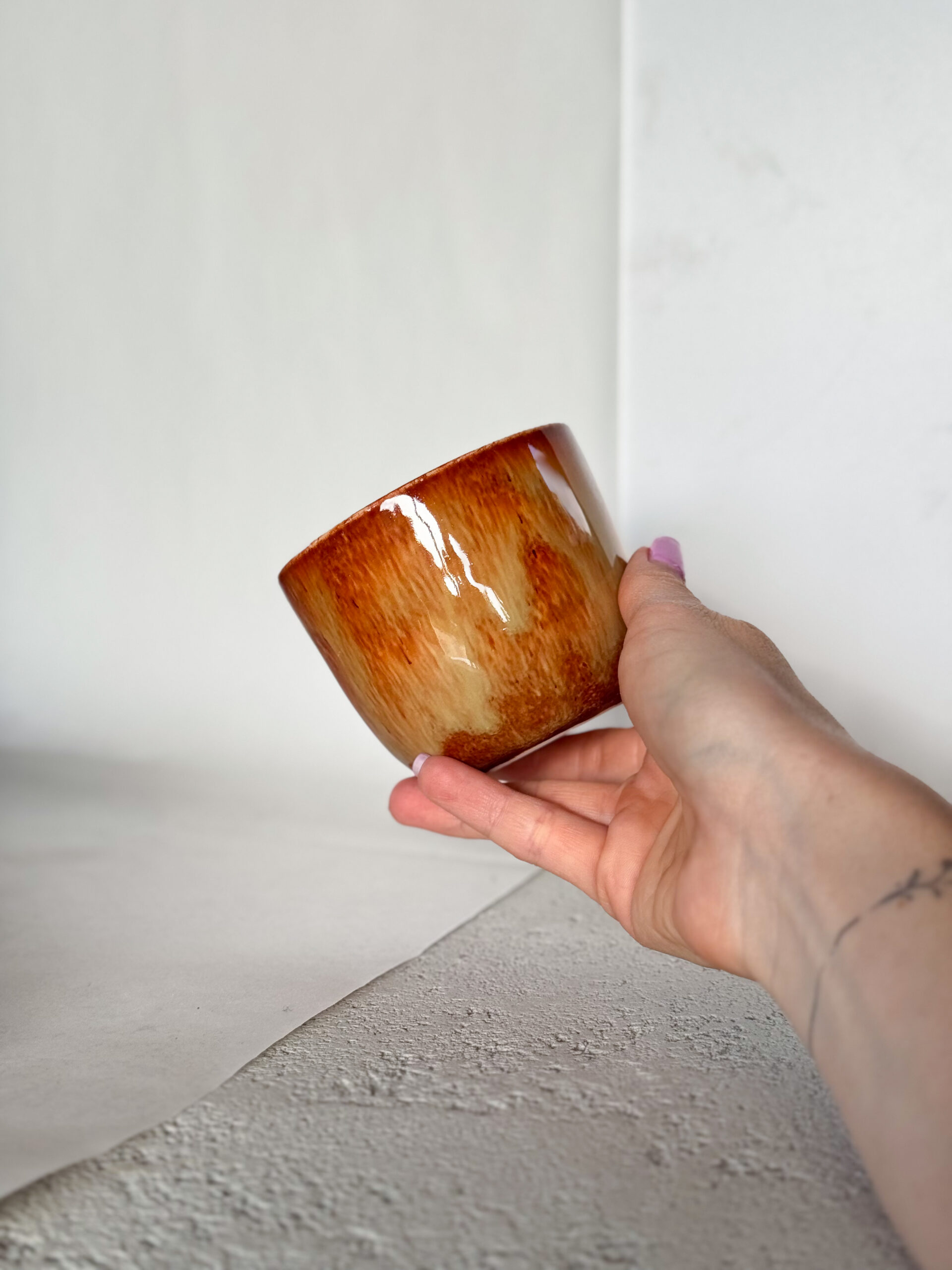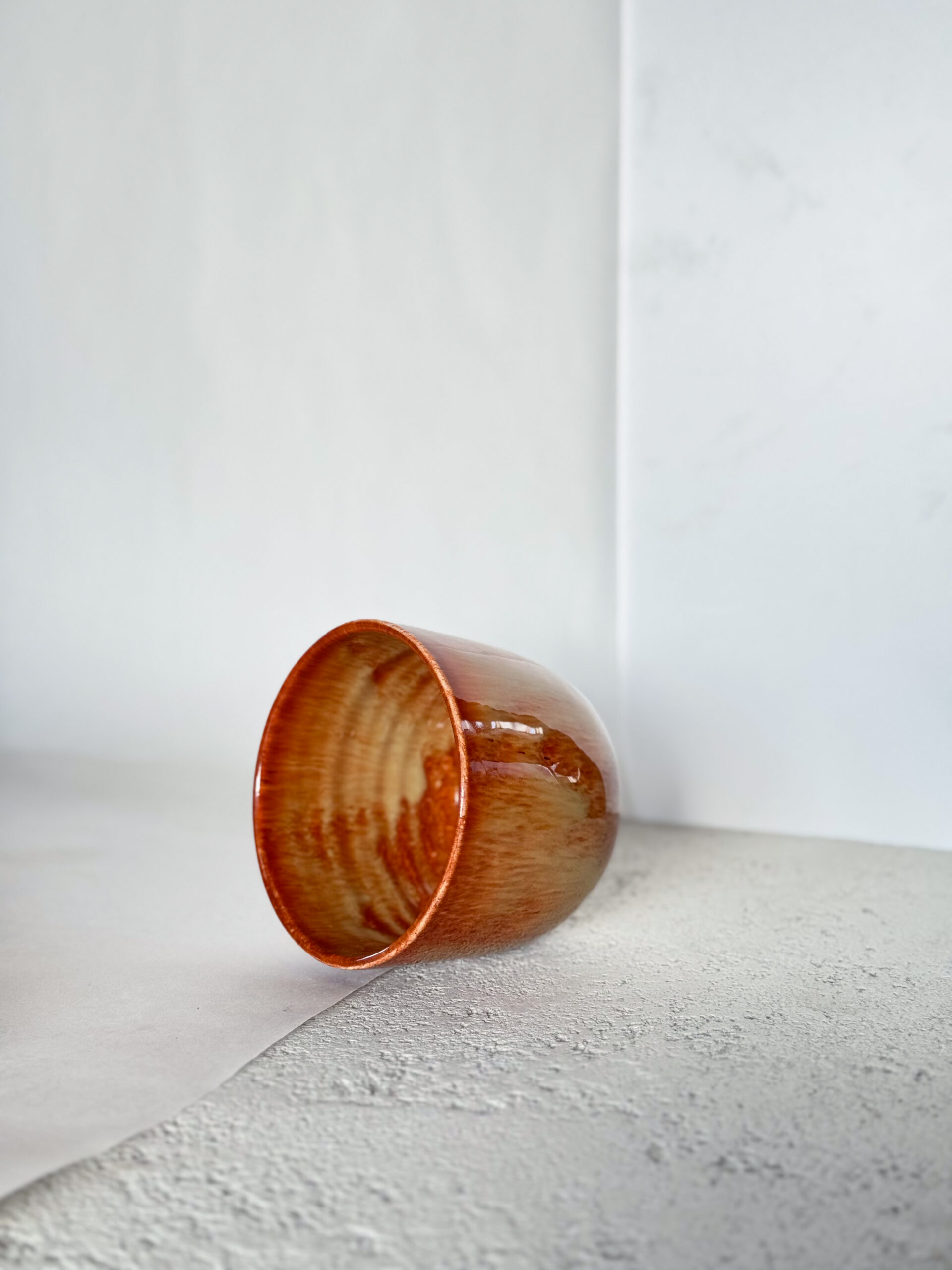 Kalíšek ze světlé hlíny s ironfall glazurou.