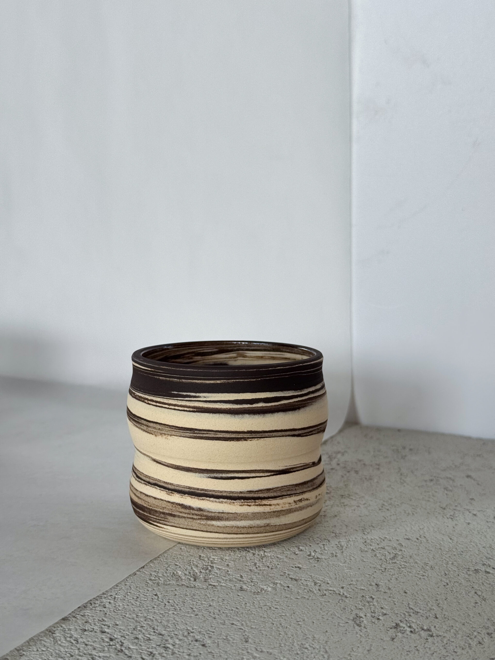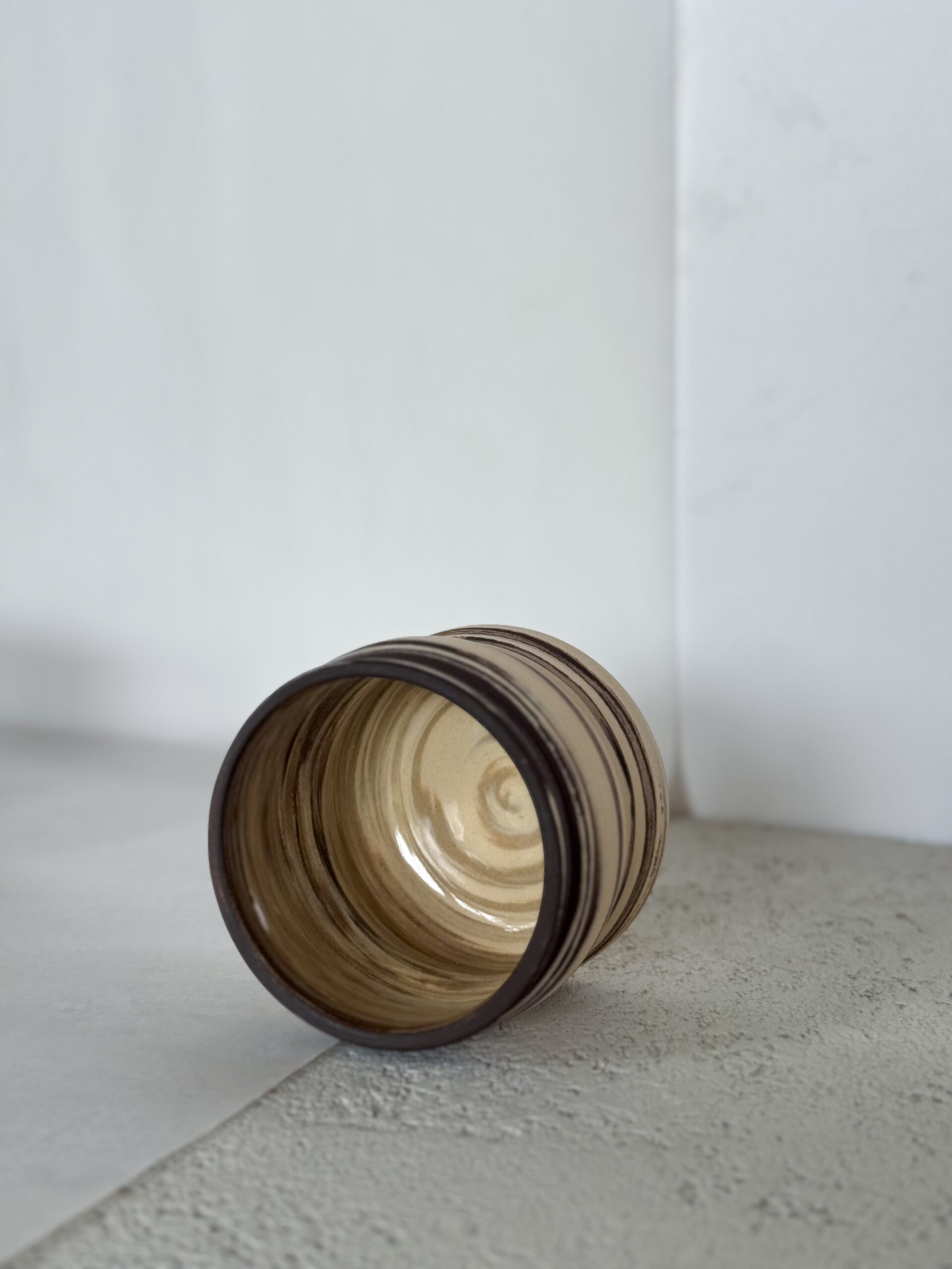 Kalíšek z několika hlín s transparentní glazurou uvnitř.