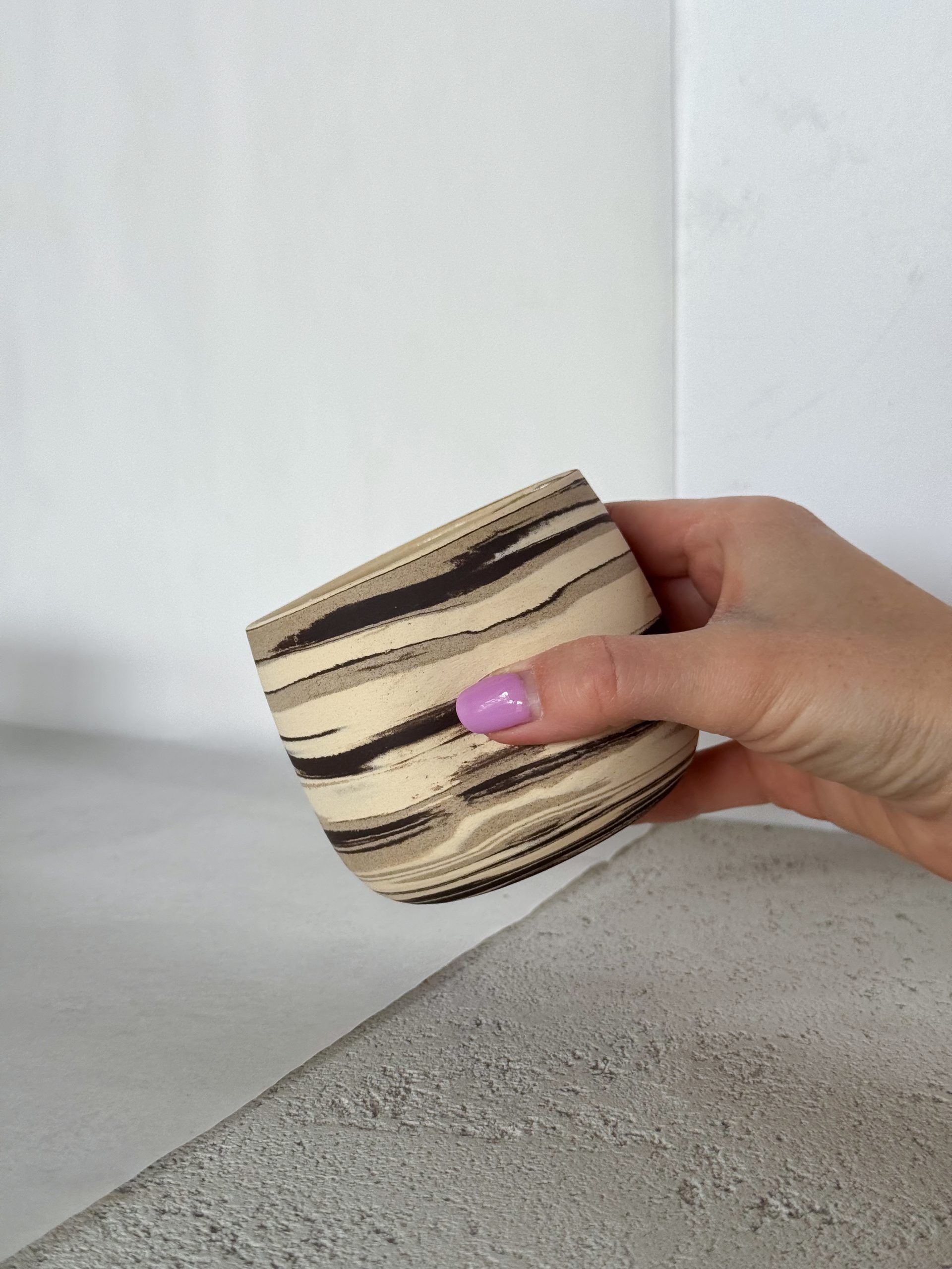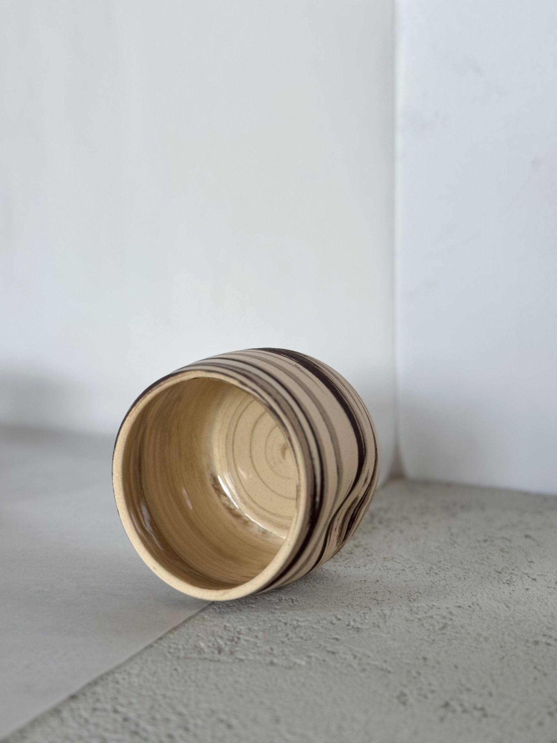 Kalíšek z několika hlín s transparentní glazurou uvnitř.