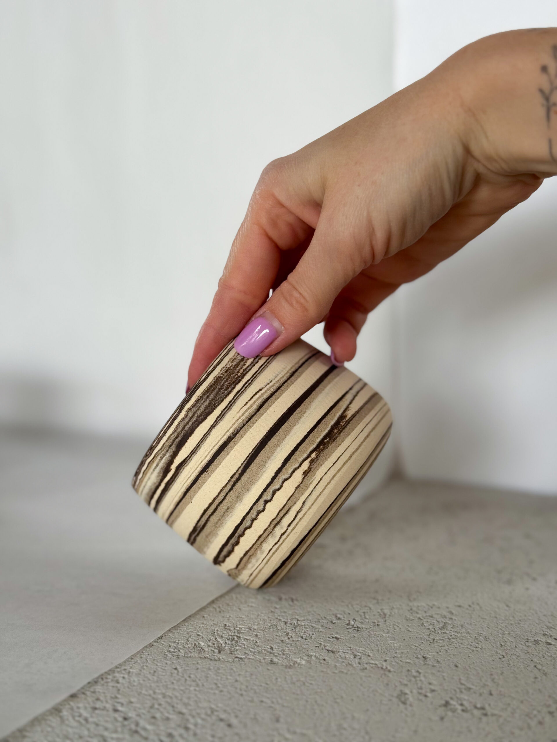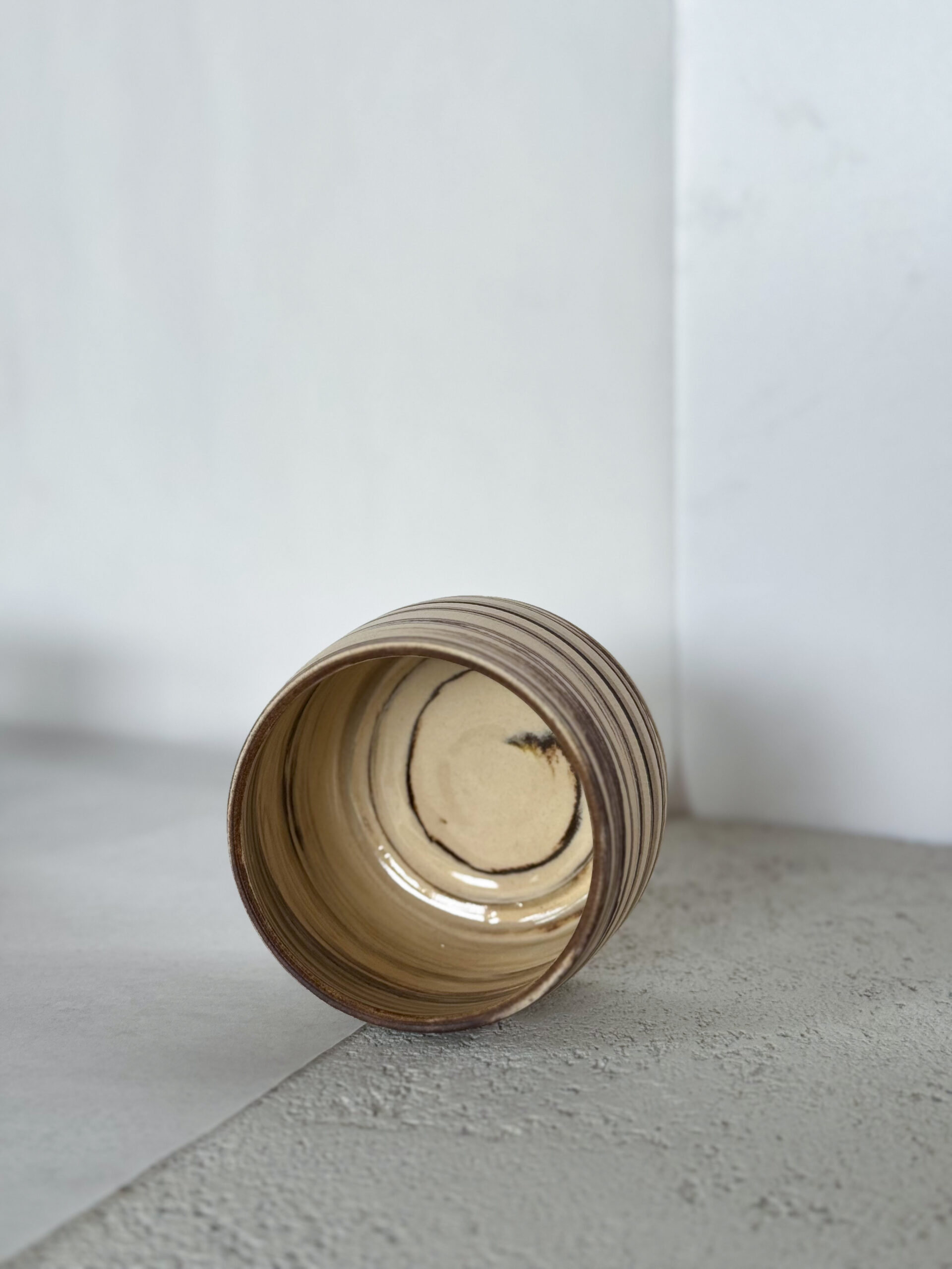 Kalíšek z několika hlín s transparentní glazurou uvnitř.