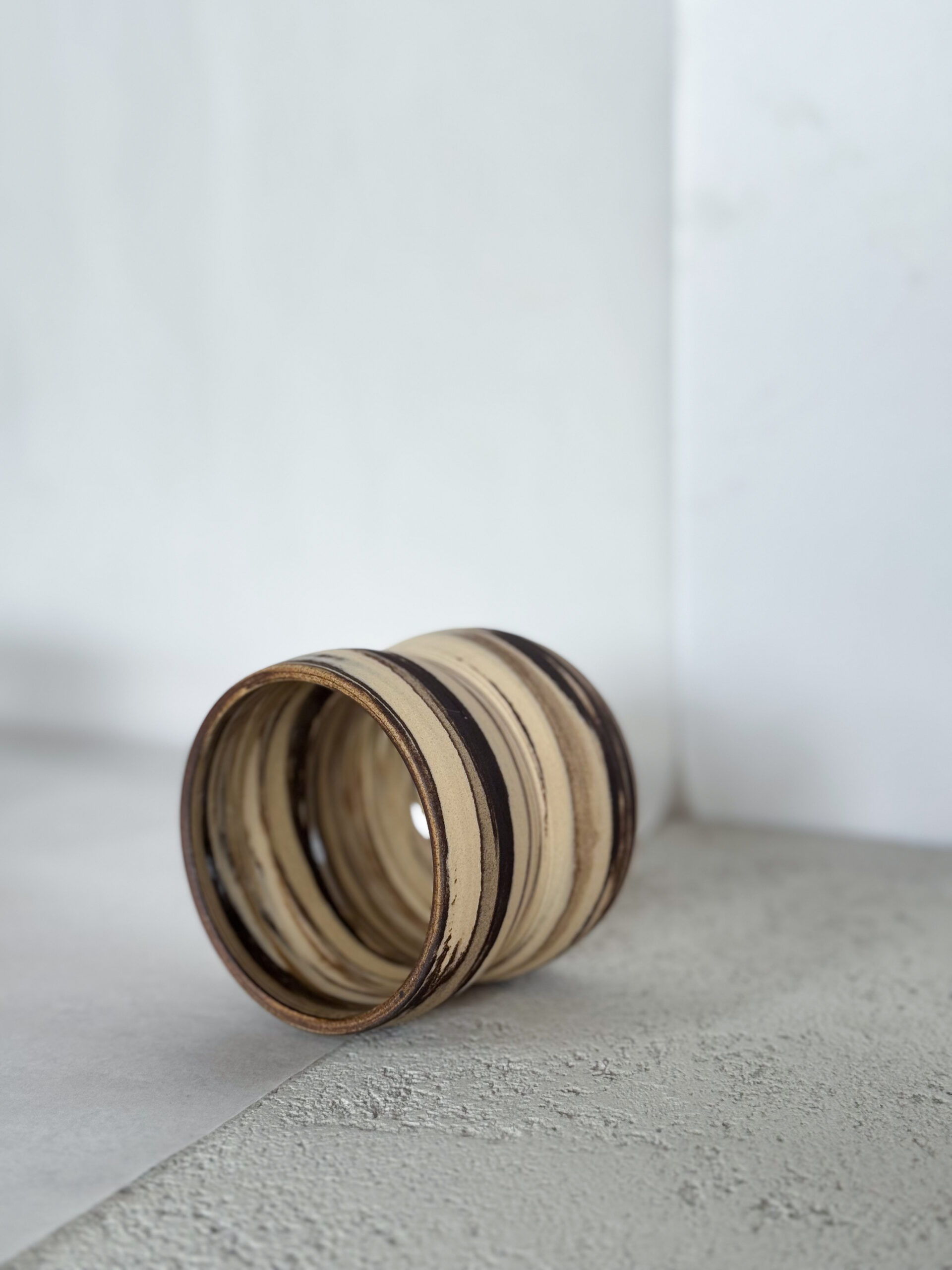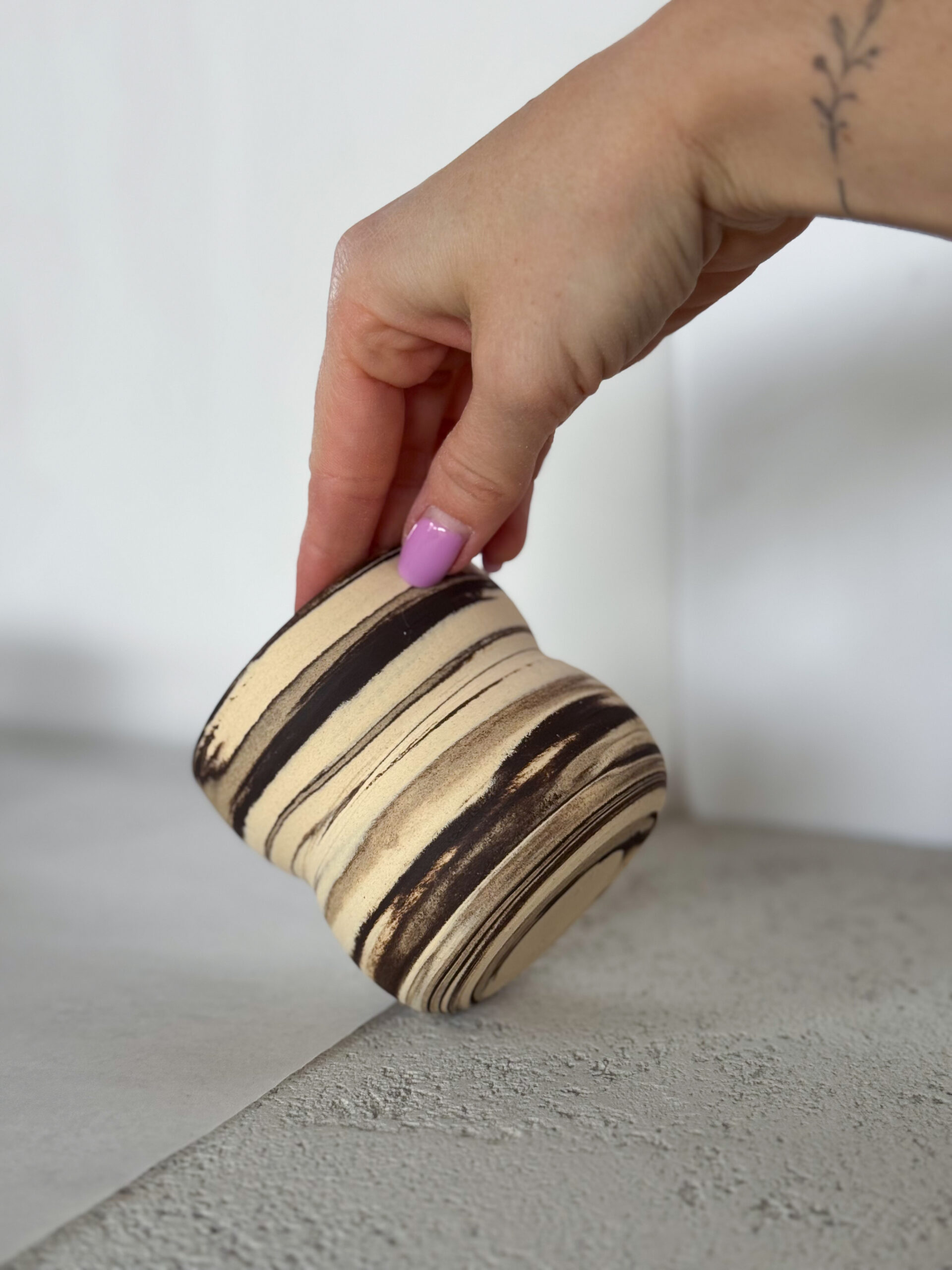 Kalíšek z několika hlín s transparentní glazurou uvnitř.