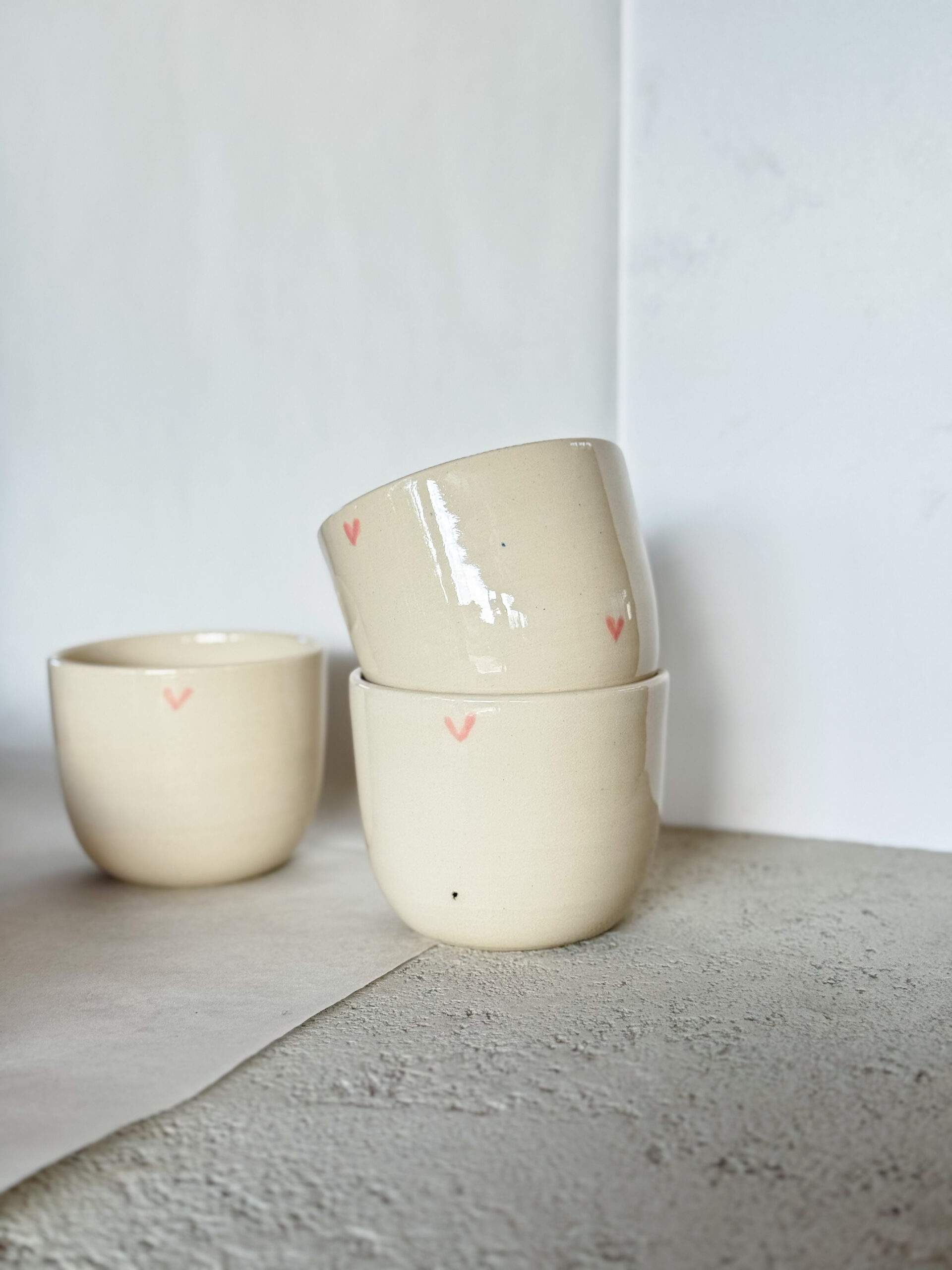 Kalíšek ze světlé hlíny s mini růžovými srdíčky. Na kalíšek mi omylem cákla černá a modrá barvička – na každém jsou asi dvě malinké ťupky.