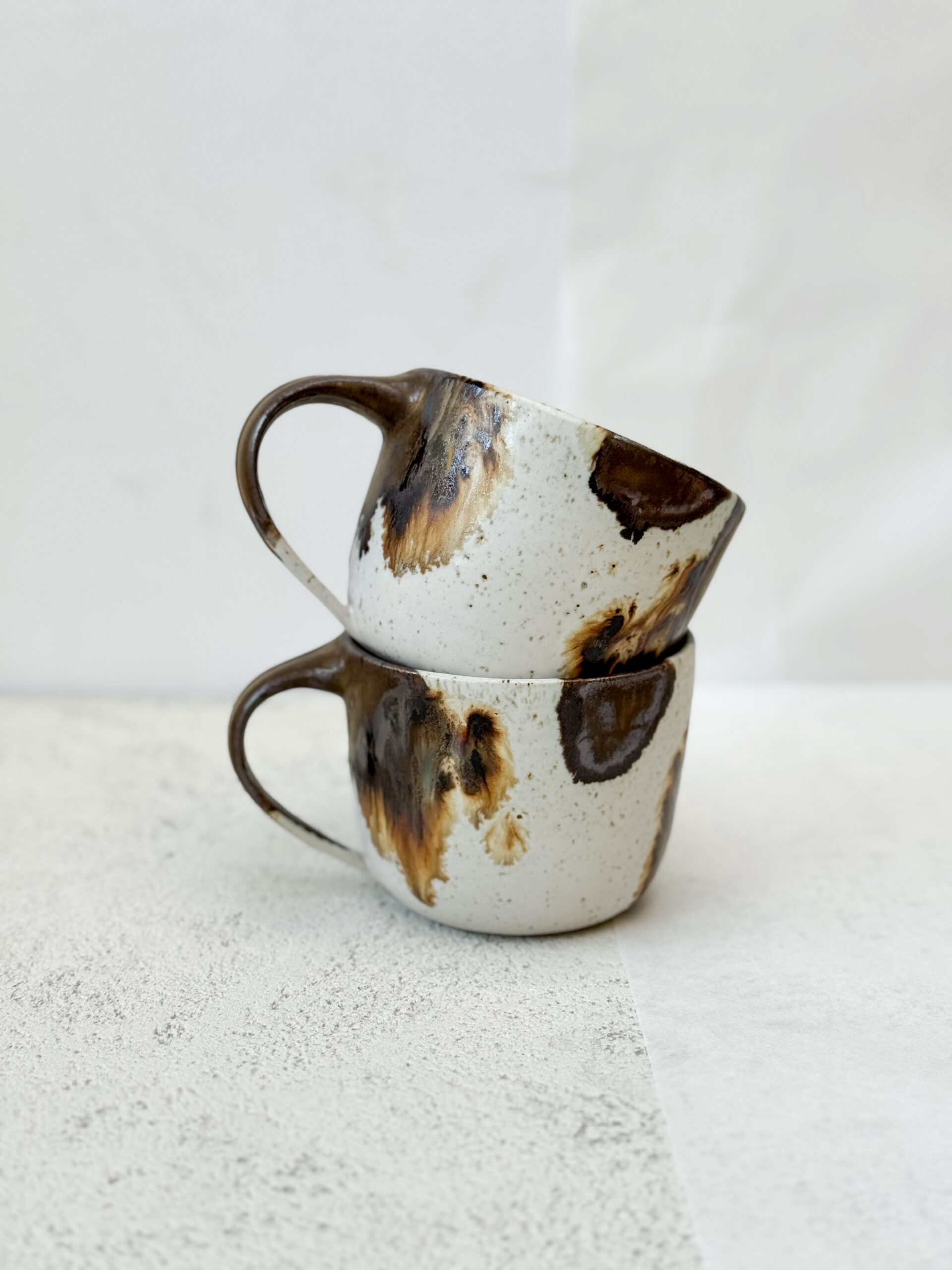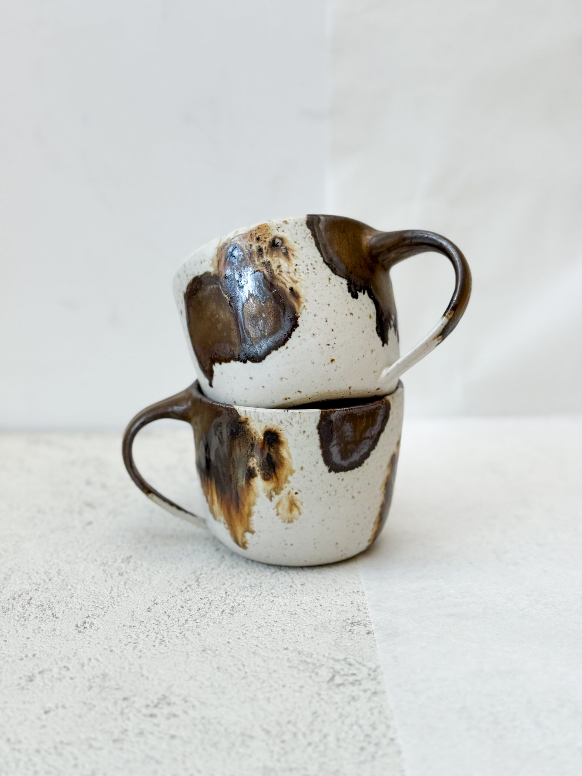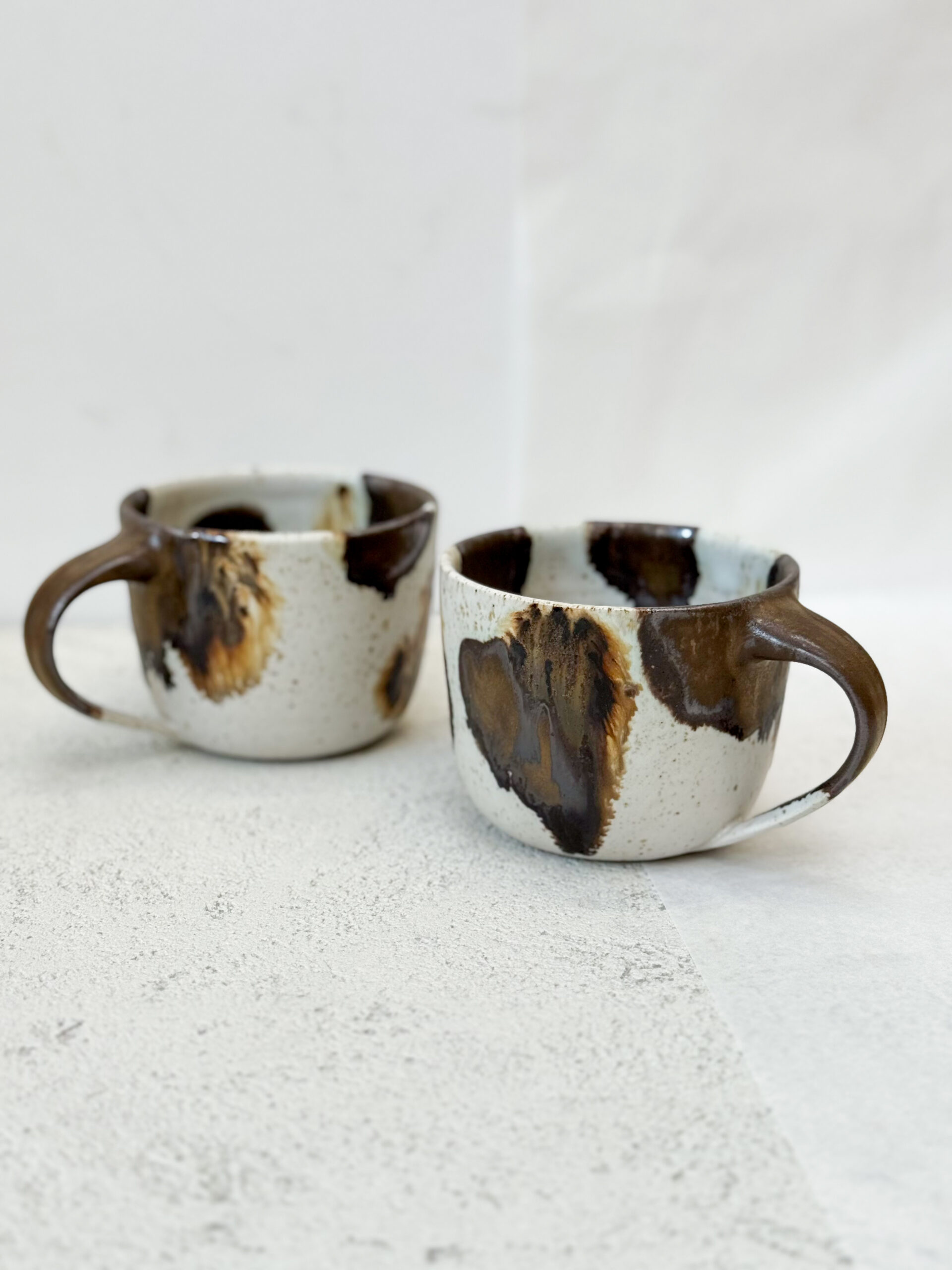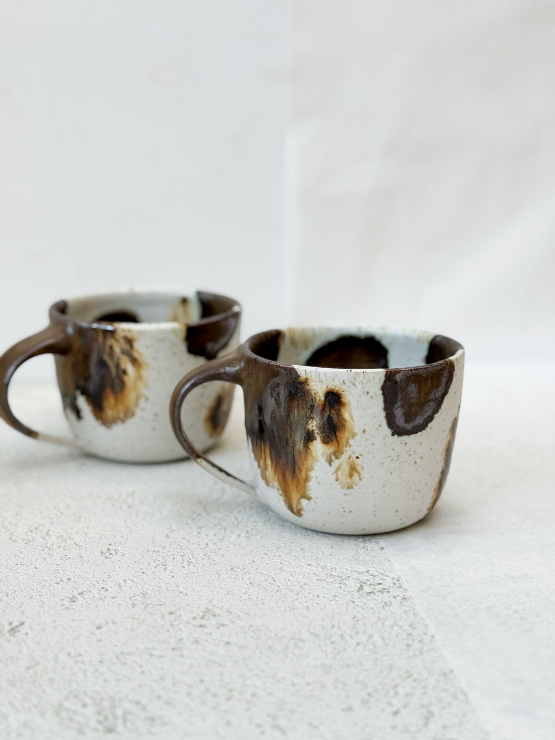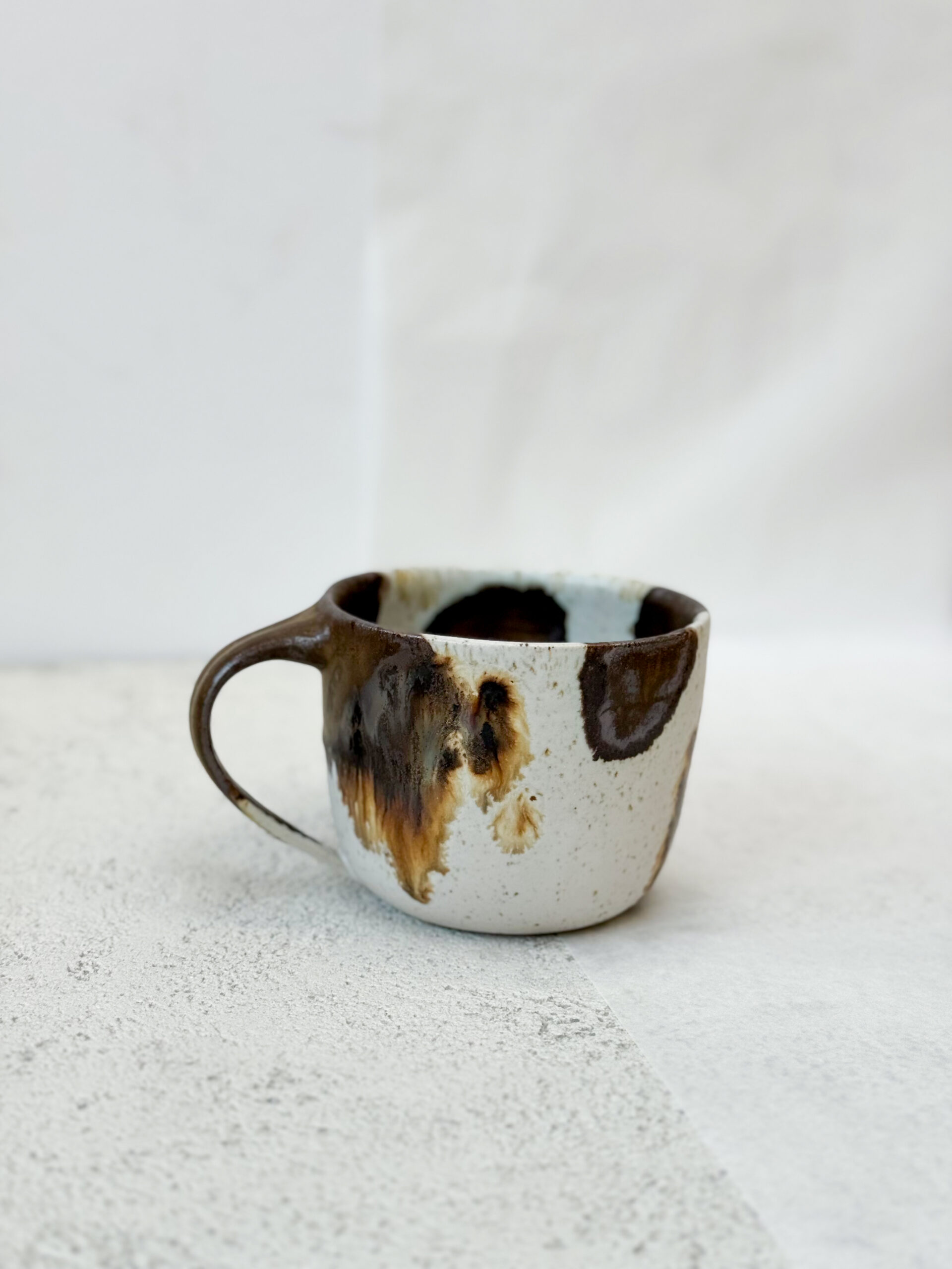Hrnek z tečkované hlíny s motivem kraví kůže.
