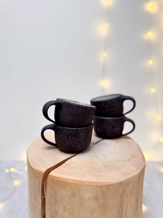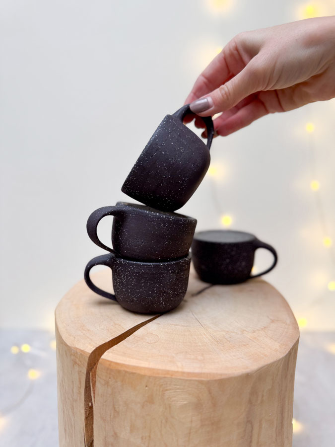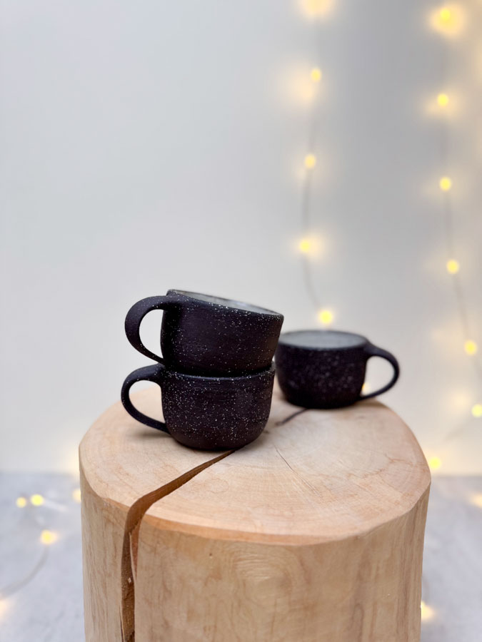 Hrneček z černé hlíny s bílou glazurou uvnitř.