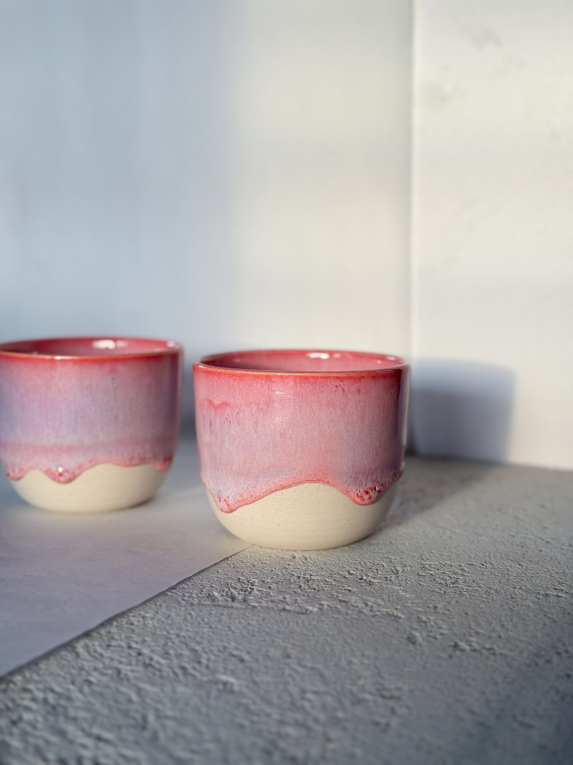 Kalíšek ze světlé hlíny s růžovou glazurou.