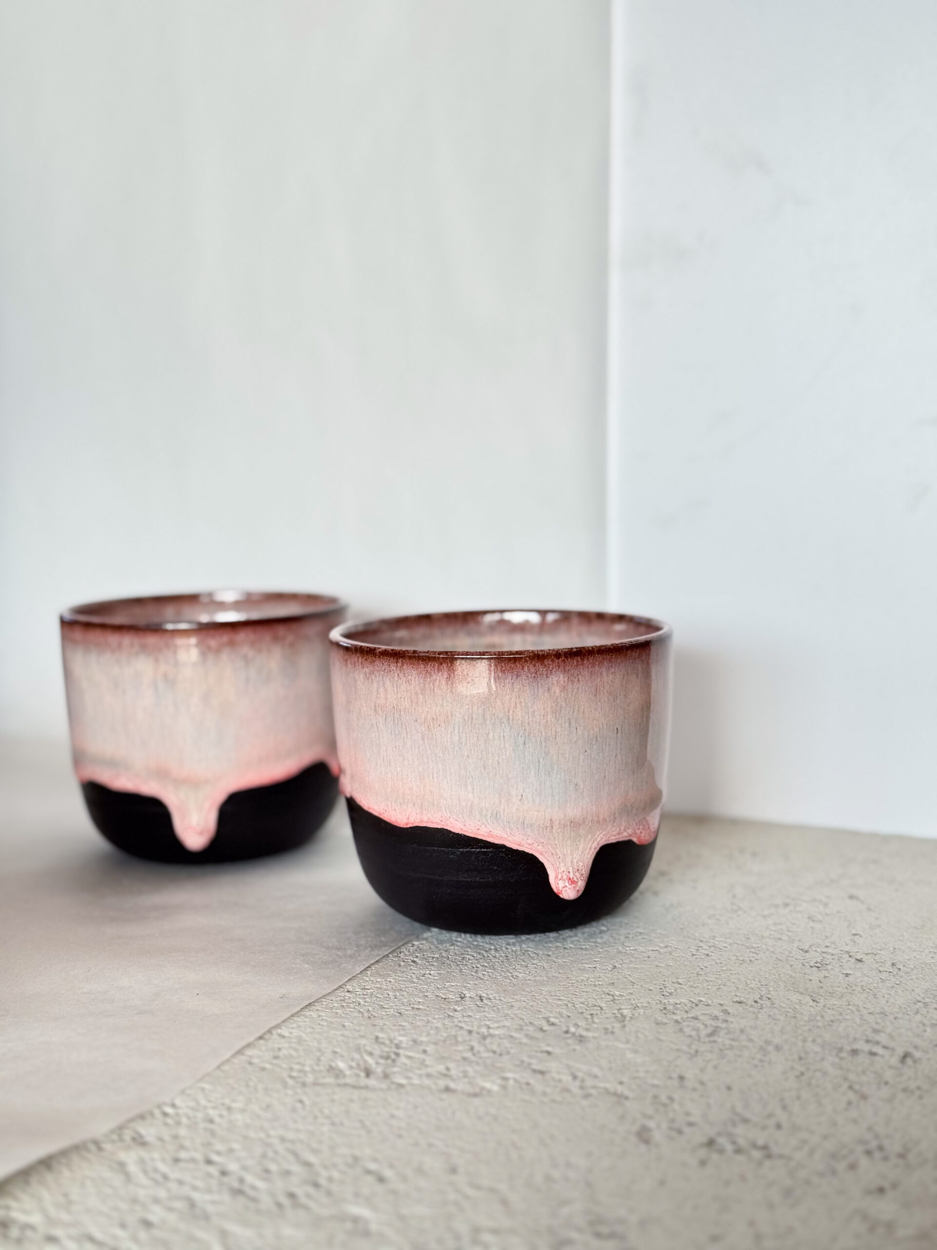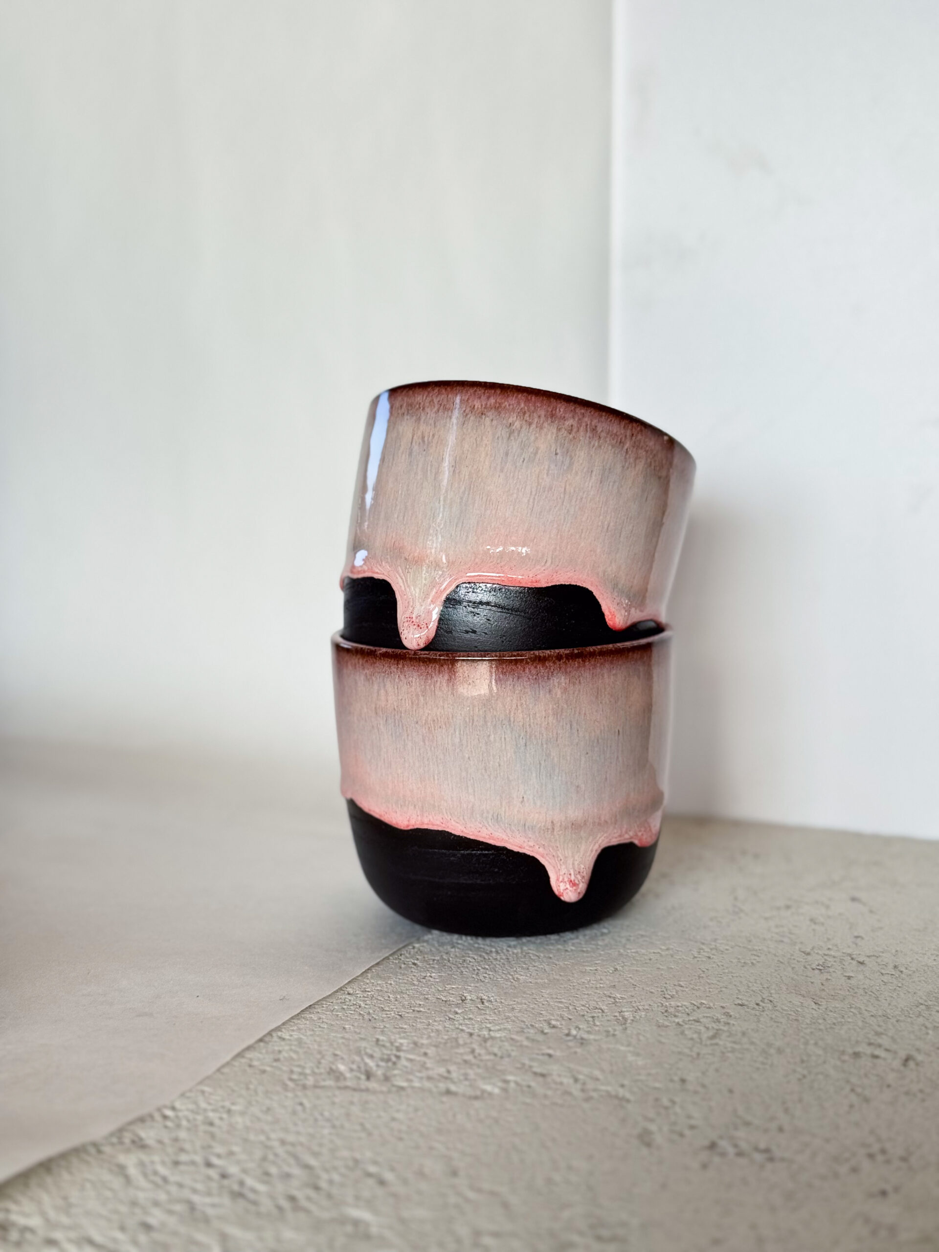 Kalíšek z černé hlíny s růžovou glazurou.