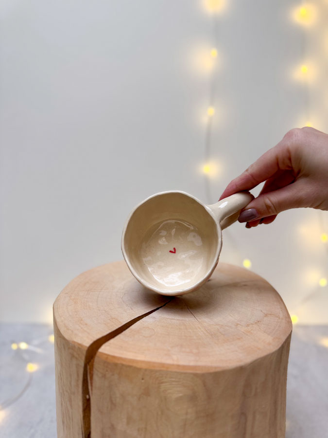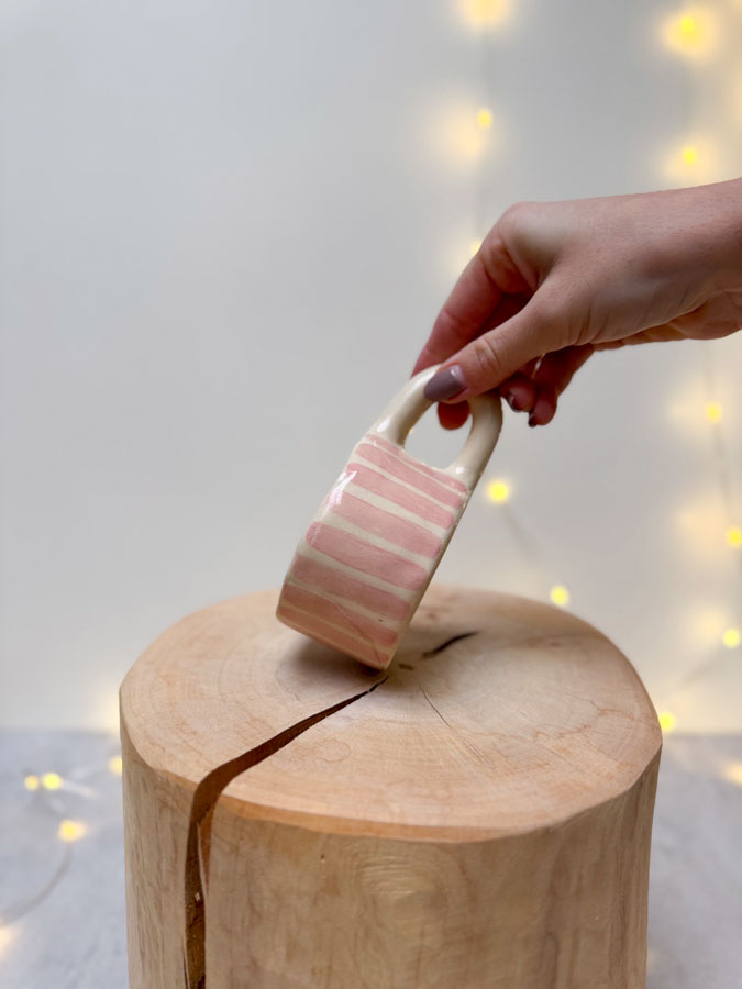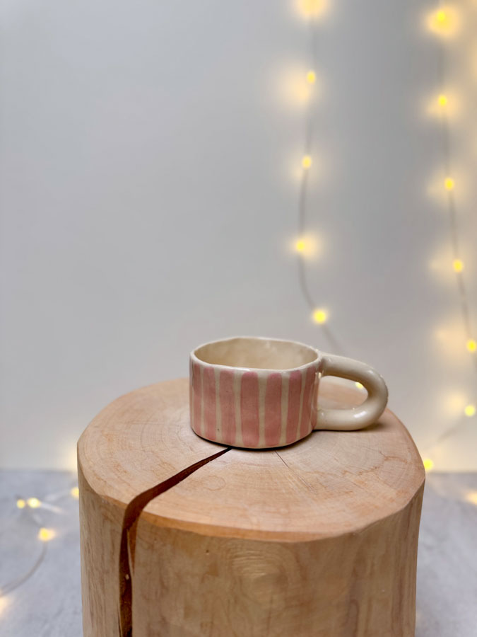 Hrnek ze světlé hlíny s proužky.