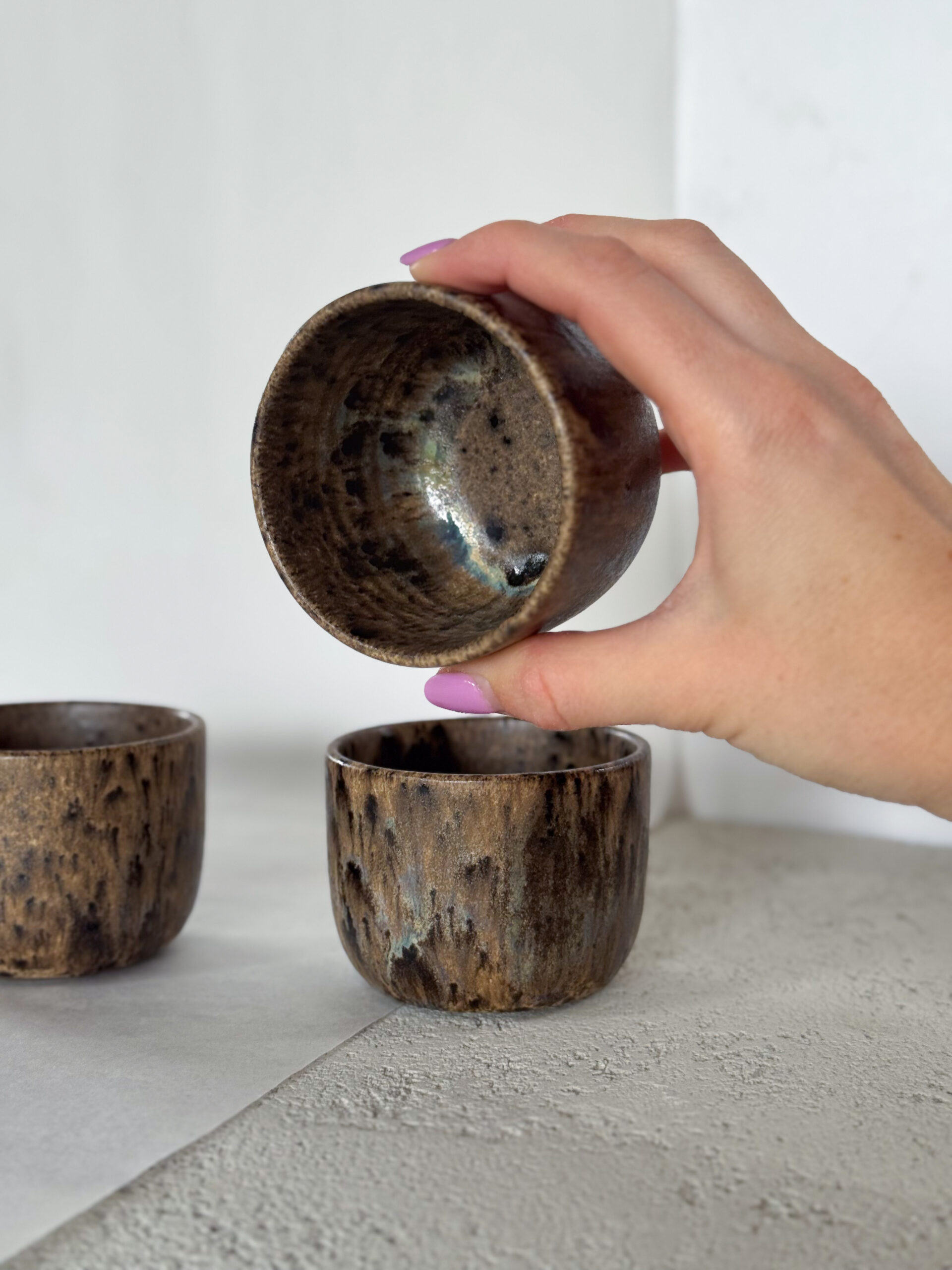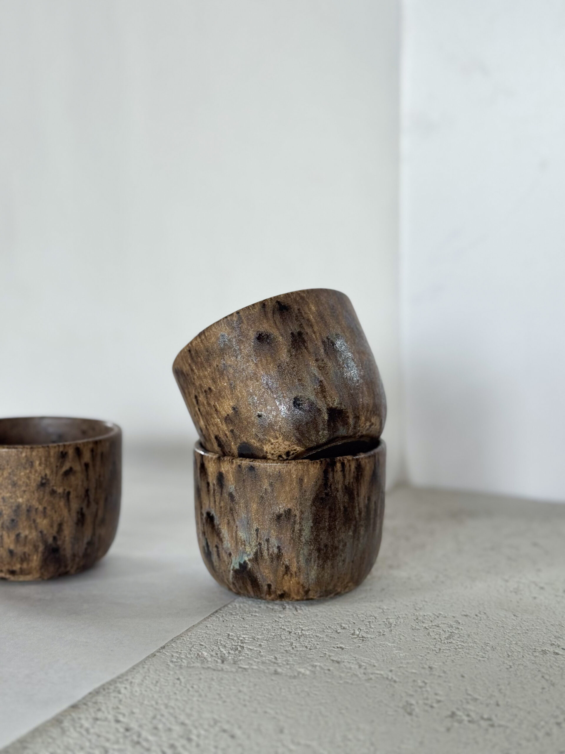 Kalíšek z černé hlíny s matnou glazurou s odlesky.