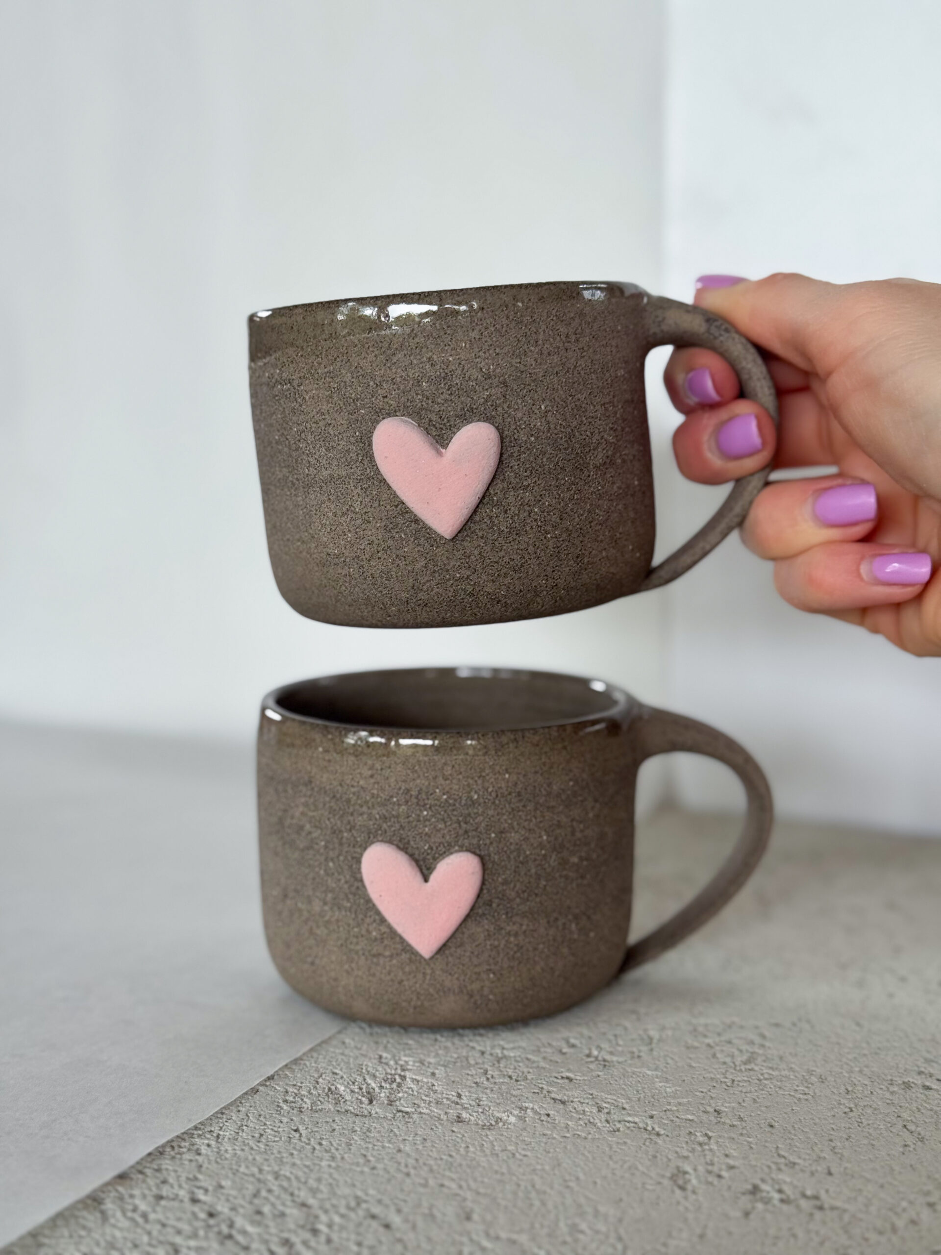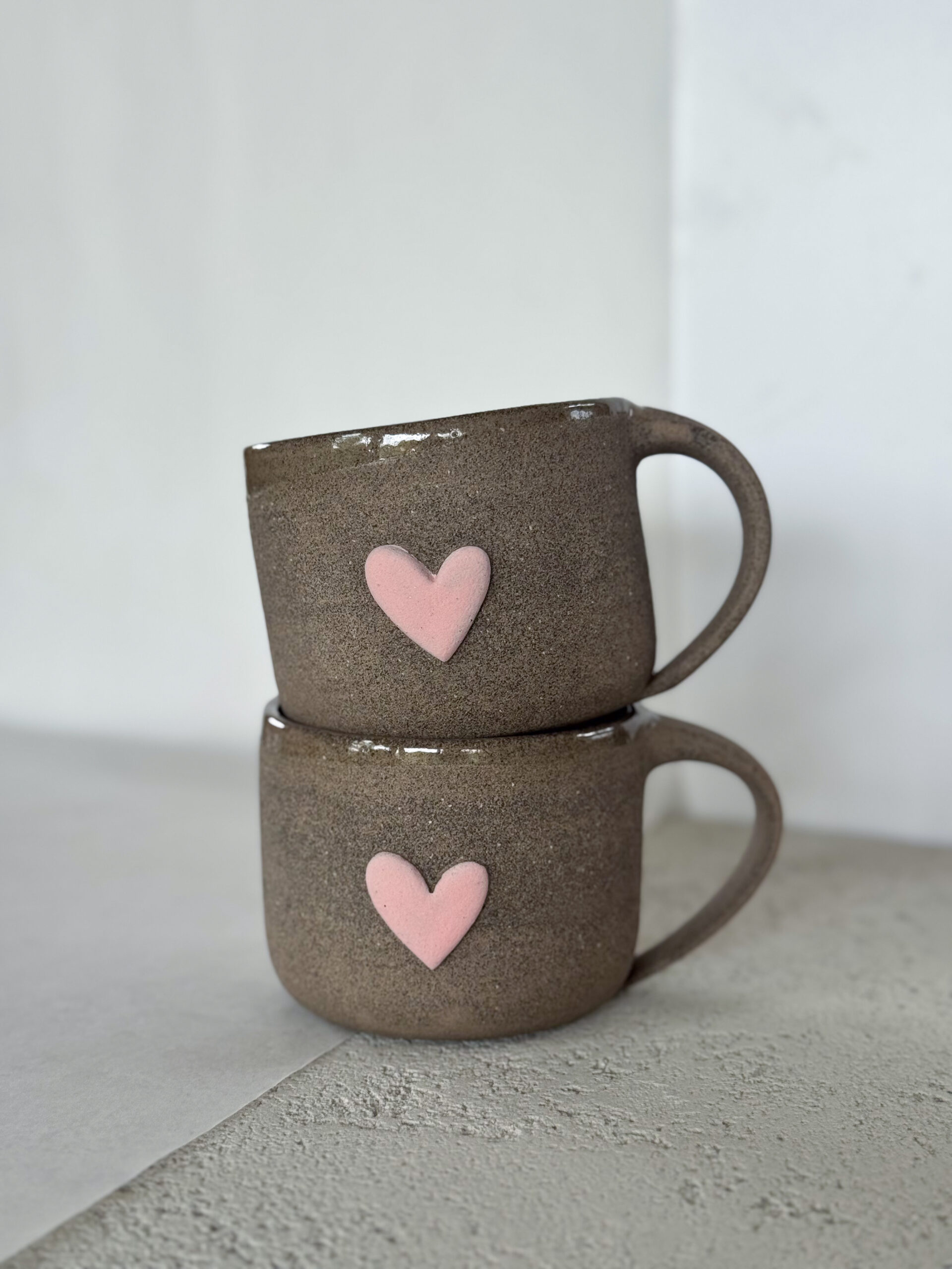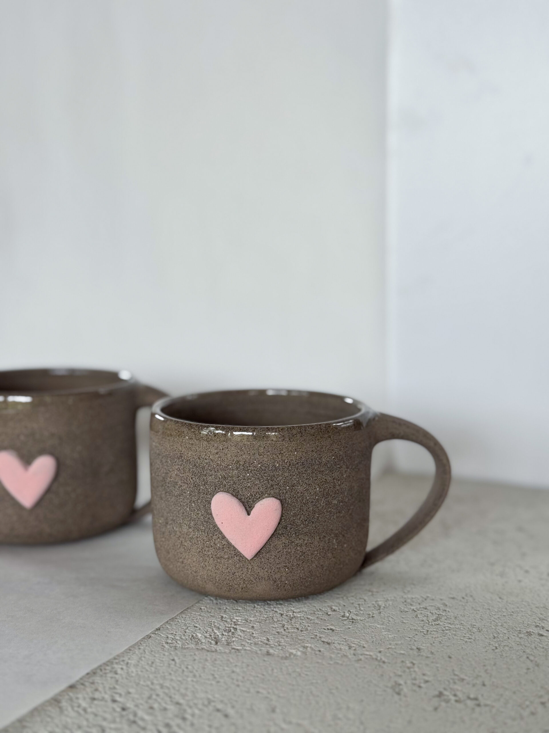 Hrnek ze šedé hlíny se srdíčkem.